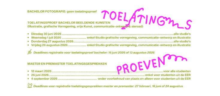De toelatingsproef bestaat uit een thuisopdracht, studio-opdracht en een goed gesprek om je beter te leren kennen. We gaan dieper in op je motivatie en inspiratie. Ontdek alle data hier.